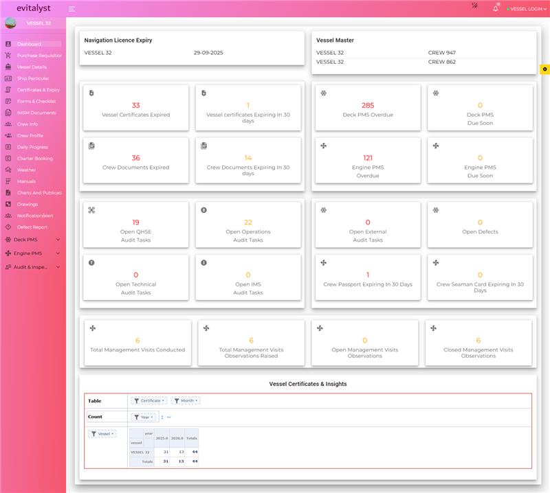 These dashboards help organizations identify risks early, prioritize actions, and maintain operational control across multiple vessels. The visual representation of data ensures that critical issues are never overlooked.